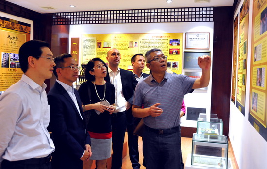 潘高壽董事長、總經理楊東升在公司文化室向雀巢(中國)大中華區董事長、首席執行官張國華一行介紹企業歷史發展概況